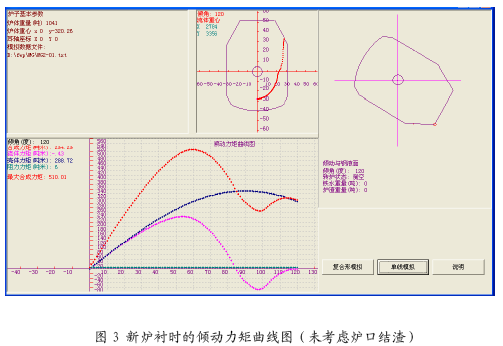 如果在現(xiàn)有的轉(zhuǎn)爐上增加滑板擋渣系統(tǒng),就要考慮出鋼口新增滑板擋渣機(jī)對(duì)轉(zhuǎn)爐傾動(dòng)力矩的影響。以下為該鋼廠新上滑板擋渣系統(tǒng)后轉(zhuǎn)爐傾動(dòng)力矩計(jì)算。新爐襯時(shí),未考慮爐口結(jié)渣,傾動(dòng)力矩曲線和凍爐力矩曲線如圖3 和圖4。