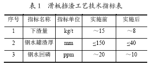 轉(zhuǎn)爐滑板擋渣技術(shù)可以更好的滿足汽車板、IF鋼、管線鋼等潔凈鋼的生產(chǎn)要求,大大地減少下渣量,滿足鋼水成分要求。實(shí)施滑板擋渣工藝后其主要技術(shù)指標(biāo)見表1。