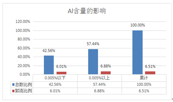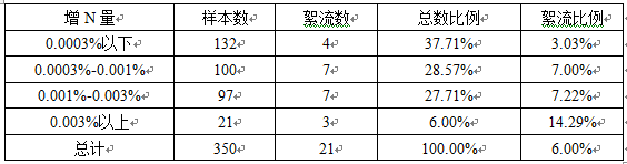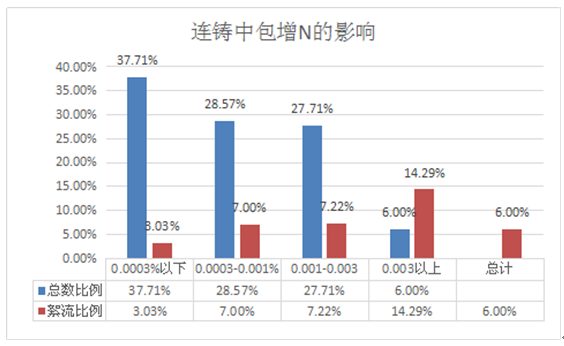 從表6和圖6的數(shù)據(jù)中可以看出,當(dāng)中包增N量低于0.0003%時(shí),絮流比例為3.03%;當(dāng)增N量在0.0003%-0.001%區(qū)間,以及0.001%-0.003%區(qū)間時(shí),絮流比例分別為7.00%和7.22%,略高于整體的6.00%;而當(dāng)增N量高于0.003%時(shí),絮流比例為14.29%明顯高于6.00%。連鑄增N偏高意味著保護(hù)澆鑄沒有做好,鋼水會(huì)出現(xiàn)較為嚴(yán)重的二次氧化,也會(huì)導(dǎo)致鋼水流動(dòng)性變差。