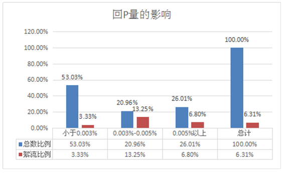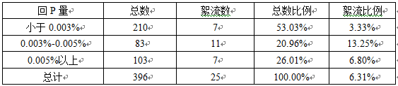 從圖4和表4的數(shù)據(jù)來看,回P量在0.003%-0.005%之間時(shí),鋼水絮流比例為13.25%,高于整體比例的6.31%;但當(dāng)回P量高于0.005%時(shí),鋼水絮流的比例為6.80%,略高于整體比例6.31%;但當(dāng)回P量小于0.003%時(shí),鋼水絮流比例明顯減少。因此,盡可能減少下渣,有利于提高鋼水的純凈度,也有利于改善鋼水的流動(dòng)性。