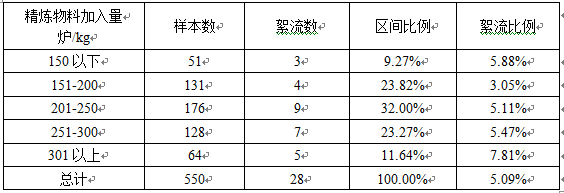 從圖5和表5的數(shù)據(jù)來看,精煉爐的物料加入量在251-300kg/爐、301kg/爐以上時(shí),出現(xiàn)絮流的比例分別為5.47%和7.81%,均高于5.09%。可以看出,當(dāng)精煉爐的物料加入量較多時(shí)出現(xiàn)絮流的比例明顯增多。統(tǒng)計(jì)的物料主要是硅錳、硅鐵和碳化硅。精煉爐物料加入量越多,精煉過程產(chǎn)生的夾雜物會(huì)增多,而且必然會(huì)導(dǎo)致整體精煉時(shí)間增加。研究表明,出鋼過程中把硅鐵加入鋼包,在中間包試樣中未發(fā)現(xiàn)鈣鋁酸鹽夾雜物(CaO·Al2O3),而在LF爐加入硅鐵尤其在LF爐后期加入硅鐵,中間包試樣中鈣鋁酸鹽夾雜物明顯增加,這也意味著水口堵塞的幾率也會(huì)明顯增加[5]。此外生產(chǎn)過程中因?yàn)樯a(chǎn)節(jié)奏的影響,精煉爐處理時(shí)間有限,無法在短時(shí)間內(nèi)進(jìn)行夾雜物的去除,也必然會(huì)導(dǎo)致鋼水中夾雜物含量上升。