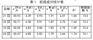 從表1 中可以看出,機燒轉(zhuǎn)鼓指數(shù)低于77%的控制標(biāo)準,在23 日出現(xiàn)了最低值72.6%,強度明顯下降。