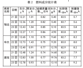 從表2 可以看出,自產(chǎn)瑞達焦炭水分較正常值5.0%升高0.2%,潞寶焦炭較正常值8.0%升高7.8%,華太焦炭較正常值8.0%升高2.5%。