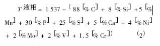 液相線溫度取決于合金和伴生元素的含量,由鋼種成分計(jì)算得到公式( 2) 。