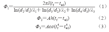 鐵水包一般分為工作層、永久層和包殼三部分。兌完鐵水的鐵水包工作層溫度很高,可高達(dá)1 200 ℃以上,其散熱主要通過傳導(dǎo)、對流和輻射三種方式進(jìn)行[13]。三種散熱方式的散熱量由式(1)~式(3)決定。