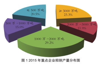 在重點統(tǒng)計企業(yè)中,2015年粗鋼產(chǎn)量超過3000萬噸的企業(yè)有四家,產(chǎn)量占重點企業(yè)比重為23.3%;產(chǎn)量2000萬-3000萬噸企業(yè)有三家,產(chǎn)量占比為11.9%;產(chǎn)量1000萬-2000萬噸企業(yè)有14家,產(chǎn)量占比為29.2%;產(chǎn)量500萬-1000萬噸企業(yè)有12家,產(chǎn)量占比為15.0%;剩余企業(yè)均為產(chǎn)量小于500萬噸企業(yè),產(chǎn)量占比為20.5%(見圖1)。