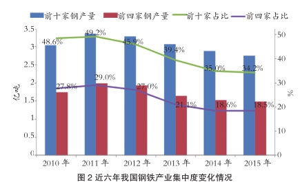 2015年我國鋼鐵產(chǎn)業(yè)集中度進一步下滑,其中,粗鋼產(chǎn)量排名前四家的企業(yè)合計產(chǎn)量占全國比重為18.5%,較2014年下降0.1個百分點;排名前十家企業(yè)合計產(chǎn)量占全國比重為34.2%,較2014年下降0.8個百分點(見圖2)。主要有以下兩點原因:一是前四家鋼廠減產(chǎn)幅度為2.74%;前十家鋼廠減產(chǎn)幅度為4.27%,均高于全國2.33%的減產(chǎn)幅度;二是重組后部分企業(yè)出現(xiàn)剝離,其中,寶鋼退出寧波鋼鐵,武鋼退出柳州鋼鐵,導致前四家和前十家鋼廠產(chǎn)量比重下降。