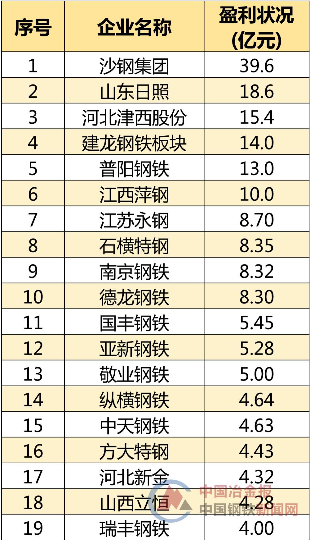 1~4月,民營(yíng)企業(yè)噸鋼利潤(rùn)167元。分企業(yè)看,盈利10億元以上企業(yè)6家,分別是:沙鋼集團(tuán)(39.6億元)、山東日照(18.6億元)、河北津西股份(15.4億元)、建龍鋼鐵板塊(14億)、普陽(13億元)、江西萍鋼(10億元)。盈利4億元以上的13家,分別是:永鋼(8.7億元)、石橫特鋼(8.35億元)、南鋼(8.32億元)、德龍(8.3億元)、國(guó)豐(5.45億元)、亞新(5.28億元)、敬業(yè)(5億元)、縱橫(4.64億元)、中天(4.63億元)、方大特鋼(4.43億元)、新金(4.32億元)、立恒(4.28億元)、瑞豐(4億元)。此外,盈利2億元以上的12家,盈利1億元以上的11家。