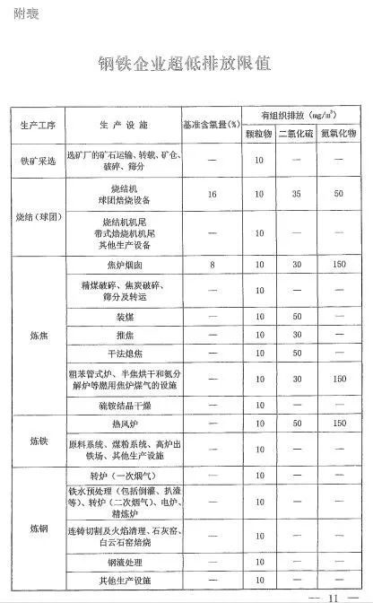 意見稿中,相應(yīng)的控制標(biāo)準(zhǔn)要求為:“燒結(jié)機(jī)頭煙氣、球團(tuán)焙燒煙氣在基準(zhǔn)含氧量16%條件下,顆粒物、二氧化硫、氮氧化物小時(shí)均值排放濃度分別不高于10、35、50毫克/立方米;其他污染源顆粒物、二氧化硫、氮氧化物小時(shí)均值排放濃度分別不高于10、50、150毫克/立方米,具體指標(biāo)限值見附表。在評(píng)估周期內(nèi),鋼鐵企業(yè)至少95%以上小時(shí)均值排放濃度滿足上述要求,方可認(rèn)定為達(dá)到超低排放水平。”