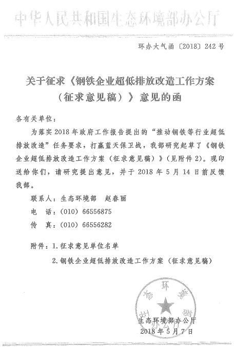 近期,生態(tài)環(huán)境部辦公廳發(fā)布關(guān)于征求《鋼鐵企業(yè)超低排放改造工作方案(征求意見稿)》意見的函。