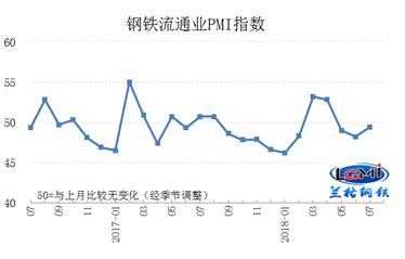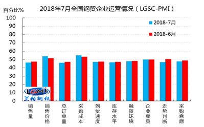 三是流通環(huán)節(jié)心態(tài)回暖。7月份鋼鐵市場走勢判斷指數(shù)升至50.5,環(huán)比回升3.5個百分點。受近期中央釋放的擴大內(nèi)需、加大投資、有望放松貨幣政策等信號的影響,再疊加供給側(cè)環(huán)保限產(chǎn)因素,社會庫存低位消耗諸多因素,鋼鐵流通環(huán)節(jié)對于下半年經(jīng)濟和需求的預期明顯回暖。7月份采購意愿指數(shù)49.0,環(huán)比回升1.4個百分點,表明鋼鐵流通企業(yè)在下個月向鋼鐵生產(chǎn)企業(yè)、或向上一級代理商采購鋼材的意愿有所增加。