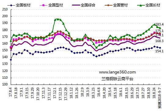 據(jù)蘭格鋼鐵云商平臺周價格預(yù)測模型數(shù)據(jù)測算,下周(2018.9.3-9.7)國內(nèi)鋼材市場價格將穩(wěn)中下跌,長材市場價格將小幅下跌,型材市場價格將小幅下跌,板材市場價格將小幅下跌,管材市場價格將穩(wěn)中下滑。蘭格鋼鐵全國鋼材綜合價格指數(shù)預(yù)計在168.3點附近波動,鋼材均價在4630元左右,平均波動10-50元左右;其中,長材價格指數(shù)預(yù)計在183.4點附近波動,下跌1.4點;型材價格指數(shù)預(yù)計在174.1點附近波動,下跌1.4點;板材價格指數(shù)預(yù)計在154.1點附近波動,下跌1.0點;管材價格指數(shù)預(yù)計在175.1點附近波動,下滑0.3點。