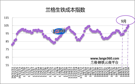 從圖1蘭格生鐵成本指數(shù)走勢(shì)圖可以看出,2018年9月份的生鐵成本指數(shù)呈持續(xù)上升走勢(shì),由月初的98.2點(diǎn)變化至月末的104.3點(diǎn),均值較上月上升5.9%。