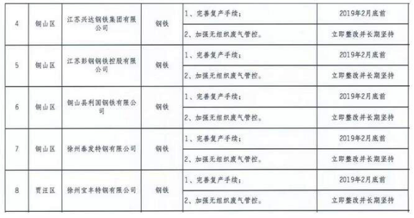 近日,徐州市還印發(fā)文件稱(chēng),針對(duì)鋼鐵等四大行業(yè)轉(zhuǎn)型升級(jí)與布局優(yōu)化調(diào)整關(guān)閉搬遷計(jì)劃中的鋼企,對(duì)其需要完成的任務(wù)清單進(jìn)行調(diào)整。其中,徐州金虹鋼鐵、中新鋼鐵、江蘇徐鋼、江蘇興達(dá)鋼鐵、江蘇彭鋼、銅山利國(guó)鋼鐵、徐州泰發(fā)特鋼、徐州寶豐特鋼等8家鋼企,仍需完善相關(guān)復(fù)產(chǎn)手續(xù)及環(huán)保改造。