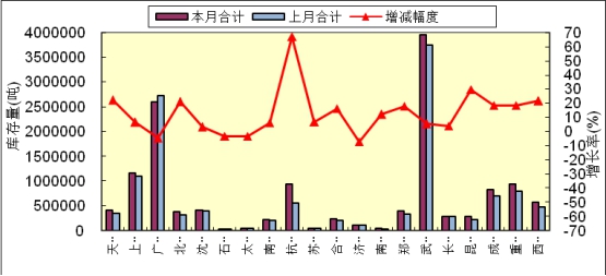 本月線材庫存環(huán)比增加的地區(qū)有15個,其中庫存增加較多的地區(qū)有天津,庫存環(huán)比增加1.2萬噸,其中鋼材市場增加1.1萬噸,港口增加0.1萬噸;上海庫存環(huán)比增加0.2萬噸,全部為鋼材市場增加量;北京庫存環(huán)比增加1.0萬噸,杭州5.2萬噸,合肥2.0萬噸,鄭州1.3萬噸,武漢4.0萬噸,長沙0.5萬噸,昆明2.7萬噸,成都7.8萬噸,重慶5.2萬噸,西安0.8萬噸;本月庫存環(huán)比減少的地區(qū)有3個,其中減少較多的地區(qū)有廣州,庫存環(huán)比減少10.7萬噸,其中鋼材市場減少9.5萬噸,港口減少1.2萬噸;沈陽庫存環(huán)比減少0.3萬噸,石家莊0.1萬噸。