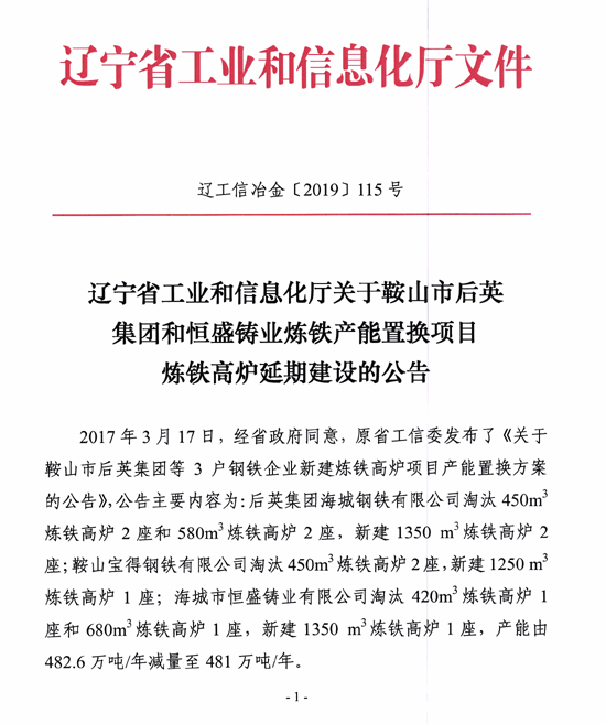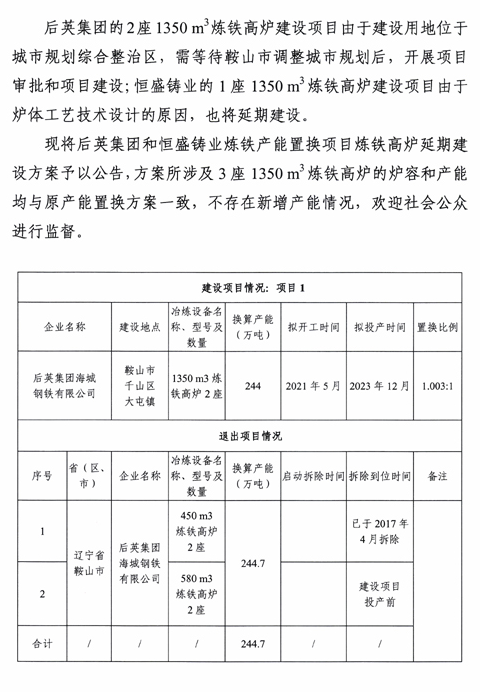 2017年3月17日,經(jīng)遼寧省政府同意,原省工信委發(fā)布了《關(guān)于鞍山市后英集團(tuán)等3戶鋼鐵企業(yè)新建煉鐵高爐項(xiàng)目產(chǎn)能置換方案的公告》,公告主要內(nèi)容為:后英集團(tuán)海城鋼鐵有限公司淘汰450m3煉鐵高爐2座和580m3煉鐵高爐2座,新建1350m3煉鐵高爐2座;鞍山寶得鋼鐵有限公司淘汰450m3煉鐵高爐2座,新建1250m煉鐵高爐1座;海城市恒盛鑄業(yè)有限公司淘汰420m3煉鐵高爐1座和680m3煉鐵高爐1座,新建1350m3煉鐵高爐1座,產(chǎn)能由482.6萬(wàn)噸年減量至481萬(wàn)噸/年。