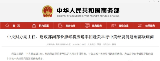 應(yīng)美方邀請(qǐng),中央財(cái)辦副主任、財(cái)政部副部長(zhǎng)廖岷擬于本周三率團(tuán)訪美,與美方就中美經(jīng)貿(mào)問題進(jìn)行磋商,為10月份在華盛頓舉行的第十三輪中美經(jīng)貿(mào)高級(jí)別磋商做準(zhǔn)備。