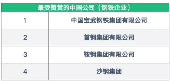 在此次公布的榜單中,共有4家鋼企被評為“最受贊賞的中國公司”。具體名單整體如下:
