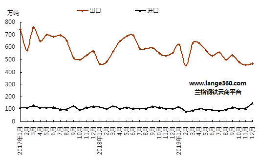 2019年12月份我國(guó)鋼材出口、進(jìn)口呈環(huán)比回升態(tài)勢(shì)。中國(guó)海關(guān)數(shù)據(jù)顯示,12月我國(guó)出口鋼材468.4萬噸,較上月增加10.9萬噸,同比下降15.8%;鋼材進(jìn)口1148.3萬噸,較上月增加44.1萬噸,同比增長(zhǎng)46.8% (詳見圖4)。2019年1-12月我國(guó)累計(jì)出口鋼材6429.3萬噸,同比下降7.3%;累計(jì)進(jìn)口鋼材1230.4萬噸,同比下降6.5%。