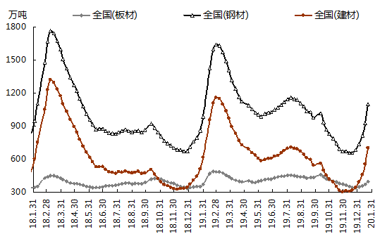 2020年1月份受春節(jié)假期及淡季需求疲軟影響,鋼材社會(huì)庫(kù)存持續(xù)大幅回升。據(jù)蘭格鋼鐵云商平臺(tái)監(jiān)測(cè)數(shù)據(jù)顯示,截至1月23日,全國(guó)29個(gè)重點(diǎn)城市鋼材社會(huì)庫(kù)存量為1098.9萬噸,月環(huán)比上升61.3%,年同比上升28.0%。其中建筑鋼材社會(huì)庫(kù)存701.9萬噸,月環(huán)比上升106.4%,年同比上升38.6%;板材社會(huì)庫(kù)存397.0萬噸,月環(huán)比上升16.3%,年同比上升12.8%(詳見圖3)。2月份仍是傳統(tǒng)累庫(kù)月份,加上當(dāng)前疫情控制需要,各省市建筑工地復(fù)工時(shí)間推遲,需求難以有效啟動(dòng),預(yù)計(jì)鋼材社會(huì)庫(kù)存將明顯上升。
