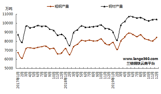 1、2019年12月份粗鋼日產(chǎn)小幅回升 后期將有所回落