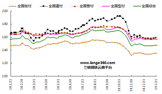 2020年1月份,國(guó)內(nèi)鋼鐵市場(chǎng)震蕩小幅下行。據(jù)蘭格鋼鐵云商平臺(tái)監(jiān)測(cè)數(shù)據(jù)顯示,截至1月23日,蘭格鋼鐵全國(guó)鋼材綜合價(jià)格指數(shù)為146.0,較上月末下降0.8%,年同比下降0.9%。其中,建材價(jià)格指數(shù)為154.9,較上月末下降0.9%,年同比下降2.2%;板材價(jià)格指數(shù)為137.1,較上月末下降0.4%,年同比下降1.7%;型材價(jià)格指數(shù)為149.3,較上月末下降0.9%,年同比下降4.6%;管材價(jià)格指數(shù)為152.6,較上月末下降1.9%,年同比下降3.9%(詳見圖1)。