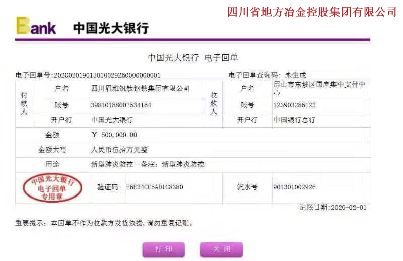 2月1日,冶控集團(tuán)眉山基地四川眉雅釩鈦鋼鐵集團(tuán)有限公司通過(guò)眉山市紅十字會(huì)和東坡區(qū)國(guó)庫(kù)集中支付中心共捐款150萬(wàn)元。該款項(xiàng)將用于定向支援新型冠狀病毒感染的肺炎疫情防控工作。