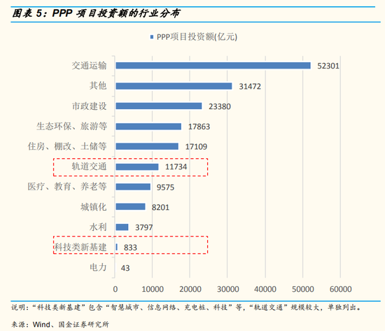 我們從 PPP 項(xiàng)目的行業(yè)分布來(lái)看,總體來(lái)看“新基建”相關(guān)項(xiàng)目占比為 7%。具體而言,“交通運(yùn)輸、市政建設(shè)”等行業(yè)投資規(guī)模相對(duì)較大,分別為 5.2 萬(wàn)億、2.3 萬(wàn)億。而“新基建”相關(guān)的軌道交通和科技行業(yè)合計(jì)規(guī)模 1.3 萬(wàn)億,總體占比達(dá) 7%。其中軌道交通為 1.2 萬(wàn)億,科技類新基建為 833 億。