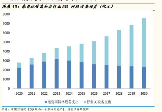 2020 年是 5G 商用初期,預(yù)計(jì)運(yùn)營(yíng)商開展 5G 網(wǎng)絡(luò)大規(guī)模建設(shè)。預(yù)計(jì)電信運(yùn)營(yíng)商在 5G 網(wǎng)絡(luò)設(shè)備上的投資超過(guò) 2200 億元,各行業(yè)在 5G 設(shè)備方面的支出超過(guò) 540 億元,合計(jì)為 2740 億。