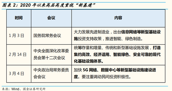 2020 年以來(lái),高層頻繁發(fā)聲,多次強(qiáng)調(diào)“新基建”的建設(shè)。3 月 4 日,政治局常務(wù)會(huì)議再次強(qiáng)調(diào)“要加快 5G 網(wǎng)絡(luò)、數(shù)據(jù)中心等新型基礎(chǔ)設(shè)施建設(shè)進(jìn)度。要注重調(diào)動(dòng)民間投資積極性”。