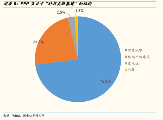 結(jié)構(gòu)上來(lái)看,科技類新基建中智慧城市、信息網(wǎng)絡(luò)、充電樁和其他科技類占比分比為 72.9%、23.2%、2.5%、1.3%。