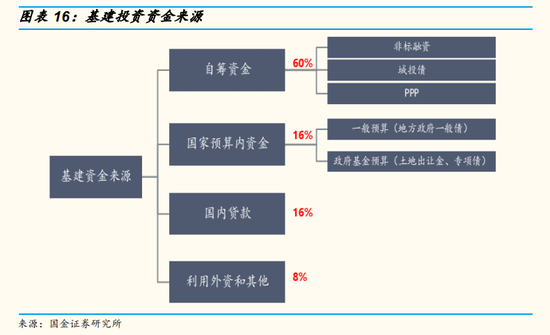 基建投資資金來(lái)源可以分為四大類:1)自籌資金(以非標(biāo)融資、城投債和PPP 等為代表),占比達(dá) 60%左右;2)國(guó)家預(yù)算內(nèi)資金(包括地方政府債和土地出讓金等方式),占比達(dá) 16%左右;3)國(guó)內(nèi)貸款(銀行貸款等),占比達(dá) 16%;4)利用外資和其他資金來(lái)源,占比為 8%。