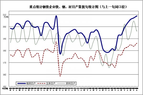 本月重點統(tǒng)計鋼鐵企業(yè)累計平均日產(chǎn)粗鋼210.92萬噸,環(huán)比增長2.80%、同比增長2.36%;生鐵188.13萬噸,環(huán)比增長1.76%、同比增長3.33%;鋼材198.04萬噸,環(huán)比增長3.52%、同比增長4.43%。