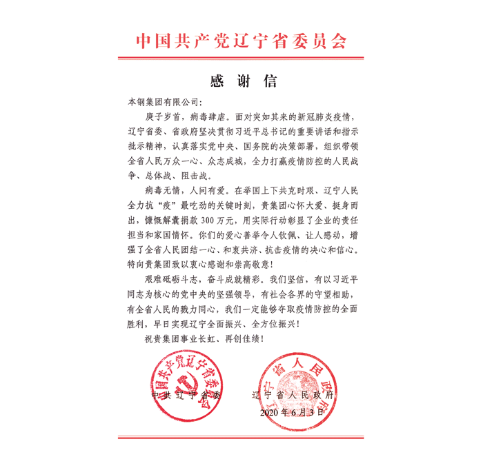 在我國(guó)新冠肺炎疫情阻擊戰(zhàn)取得重大戰(zhàn)略成果,經(jīng)濟(jì)社會(huì)發(fā)展工作穩(wěn)步有序推進(jìn)的時(shí)刻,本鋼集團(tuán)收到了一封來(lái)自遼寧省委、省政府的感謝信。