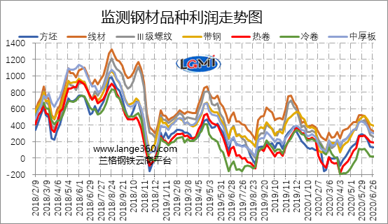 圖2是蘭格鋼鐵云商平臺(tái)監(jiān)測(cè)的各主要鋼材品種的盈利能力曲線對(duì)比。從圖2可以看出,6月份7大品種測(cè)算毛利呈波動(dòng)下降趨勢(shì),但因建材消費(fèi)淡季來臨,下游建筑工地采購(gòu)逐步放緩,6月市場(chǎng)走勢(shì)呈現(xiàn)“長(zhǎng)弱板強(qiáng)”格局,各品種盈利均值與上月同期相比表現(xiàn)有所分化,鋼坯和建材品種盈利下降,板材品種除中厚板外盈利均有上升。上升品種中,熱軋卷板毛利上升最多,為39元/噸,帶鋼和冷軋卷板毛利分別上升33元/噸和20元/噸;下降品種中,線材毛利下降最多,為71元/噸,其他品種毛利降幅在33-48元/噸之間。