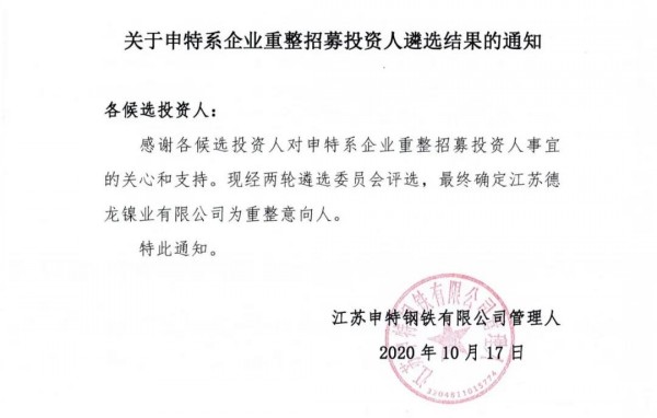 10月17日,江蘇申特有限公司管理人發(fā)布《關(guān)于申特系企業(yè)重整招募投資人遴選結(jié)果的通知》:經(jīng)兩輪遴選委員會評選,最終確定江蘇德龍鎳業(yè)有限公司為重整意向人。