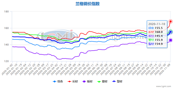 從全年各月走勢分析,中國鋼材價格呈現(xiàn)先抑后揚態(tài)勢。今年一季度,因為疫情負面沖擊,全國鋼材市場行情低迷。隨著鋼材需求得到強化,從4月份開始走出低谷,持續(xù)性震蕩揚升。截止到11月10日,全國鋼材綜合價格指數(shù),比今年低點(4月8日)上漲了15.6%。其中長材指數(shù)上漲15.3%,板材指數(shù)上漲18.9%。