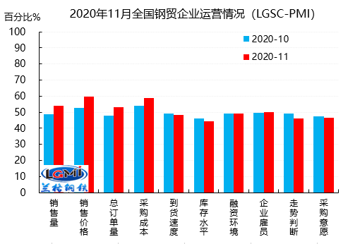 從先行指數(shù)來看,2020年11月份鋼鐵流通業(yè)采購意愿指數(shù)為46.6,較上月下降1.0個百分點,在收縮區(qū)間內(nèi)再度下滑。走勢判斷指數(shù)為46.1,較上月下降3.0個百分點,在收縮區(qū)間內(nèi)快速下降,反映樣本企業(yè)對后期市場謹(jǐn)慎悲觀。