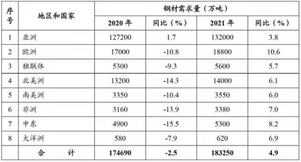 (2020年和2021年全球主要地區(qū)鋼材需求預(yù)測情況)