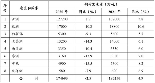2020年和2021年全球主要地區(qū)鋼材需求預(yù)測(cè)變化情況見下表。