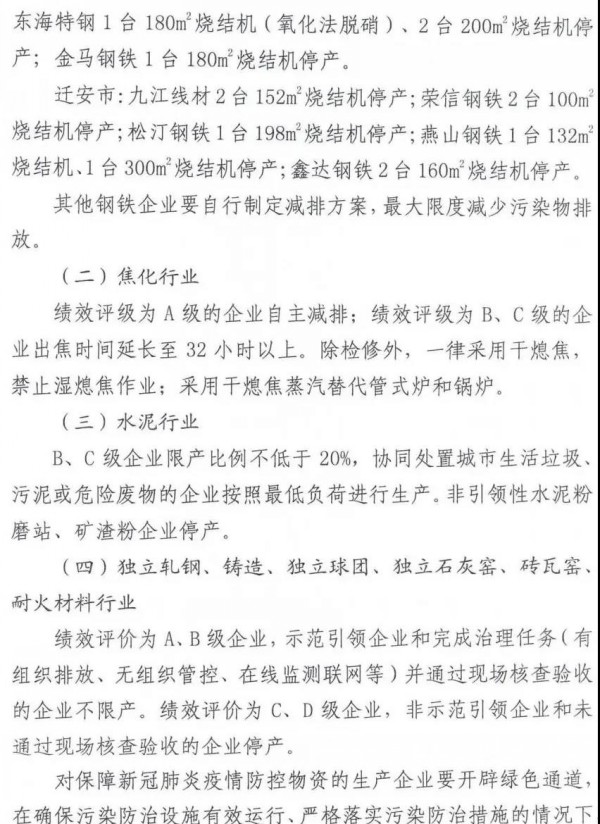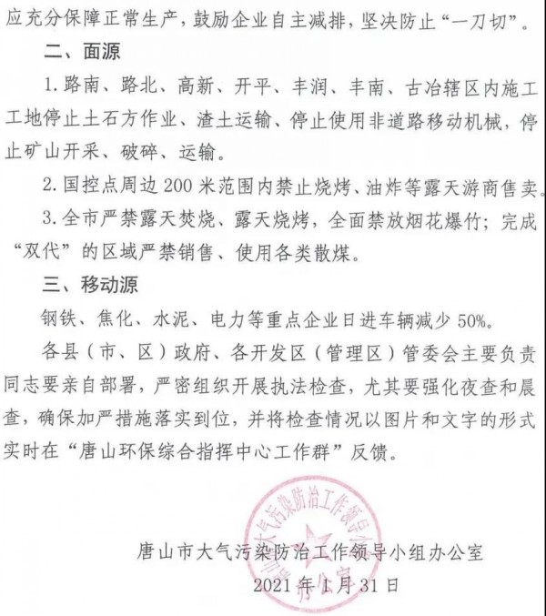 1月31日,唐山市大氣污染防治工作領(lǐng)導(dǎo)小組辦公室發(fā)布《關(guān)于進一步加嚴(yán)源頭減排措施的緊急通知》。按照該通知,自1月31日14時開始,唐山減排量增至50%,燒結(jié)機全面停限產(chǎn)。