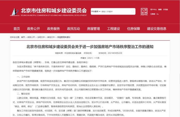 4月22日,北京市住房和城鄉(xiāng)建設委員會發(fā)布《關于進一步加強房地產市場秩序整治工作的通知》,要求依法嚴厲打擊房屋銷售、租賃市場違法違規(guī)行為。