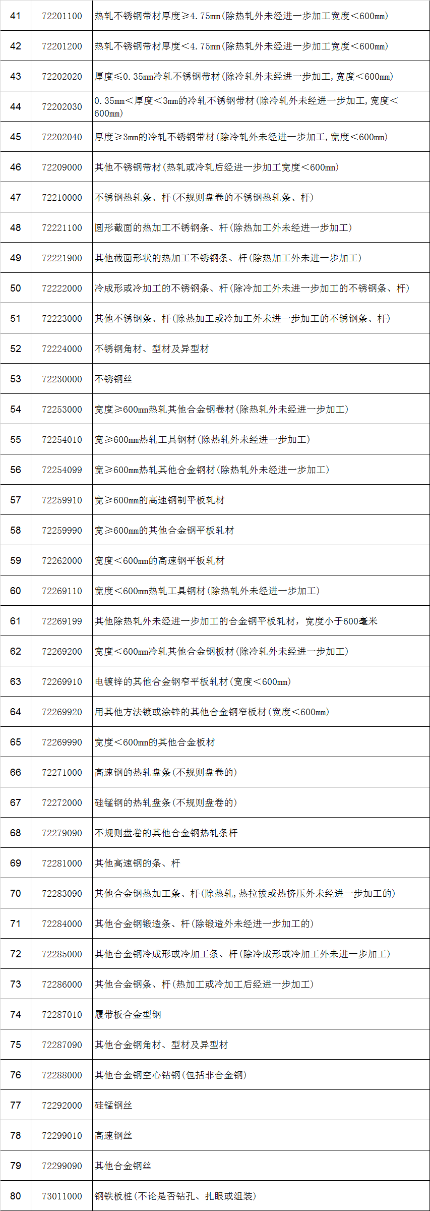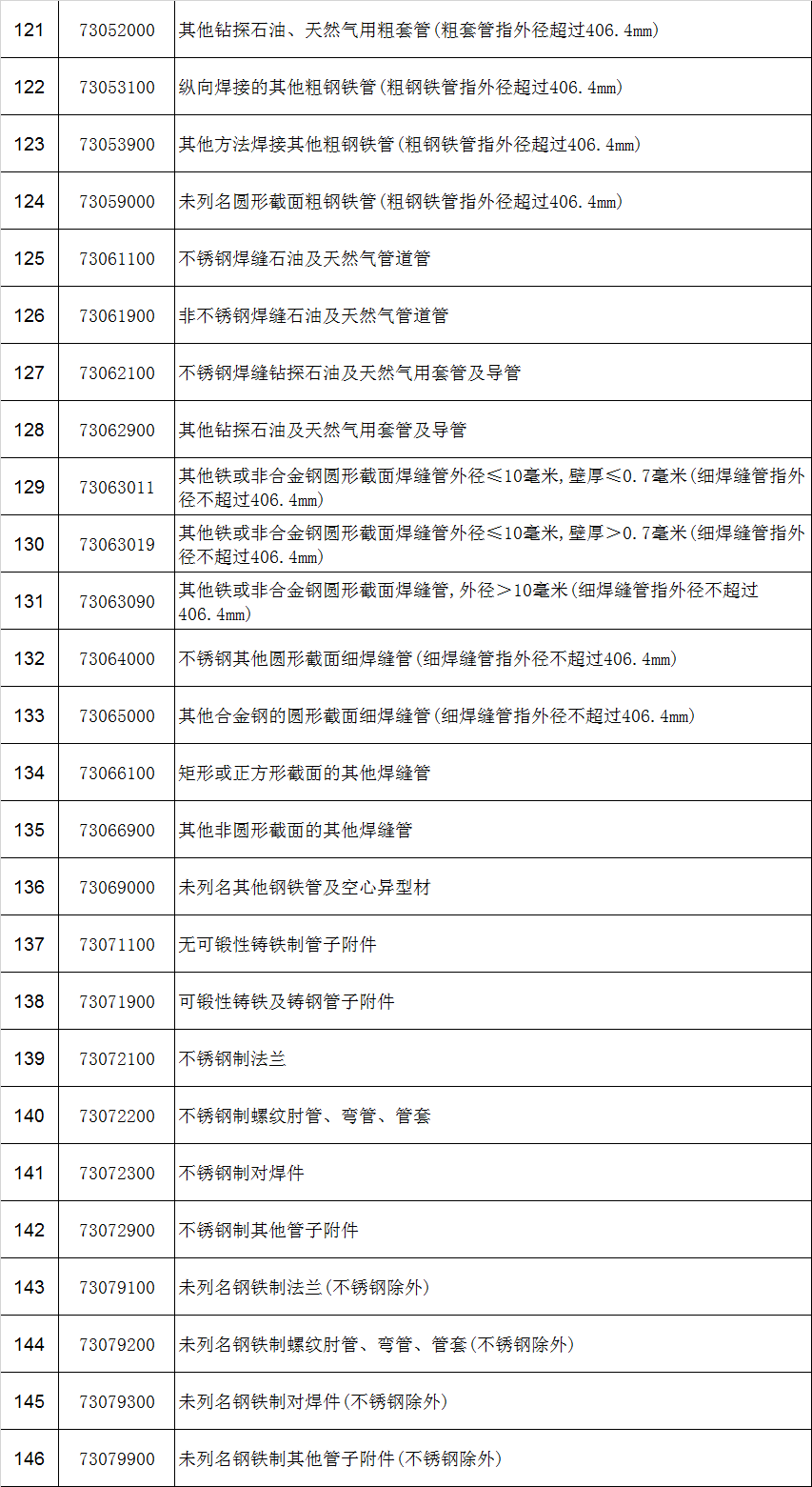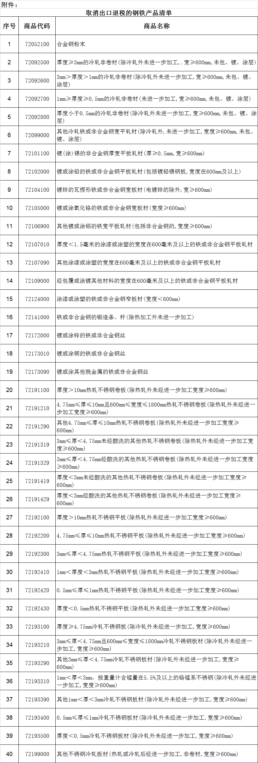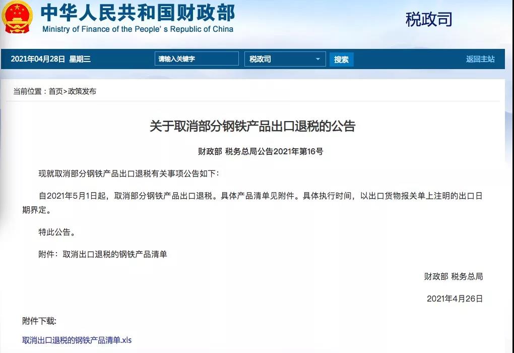 4月28日,財政部網(wǎng)站發(fā)布關(guān)于取消部分鋼鐵產(chǎn)品出口退稅的公告,共計146個稅號取消出口退稅,自2021年5月1日起執(zhí)行。具體產(chǎn)品清單見下。具體執(zhí)行時間,以出口貨物報關(guān)單上注明的出口日期界定。