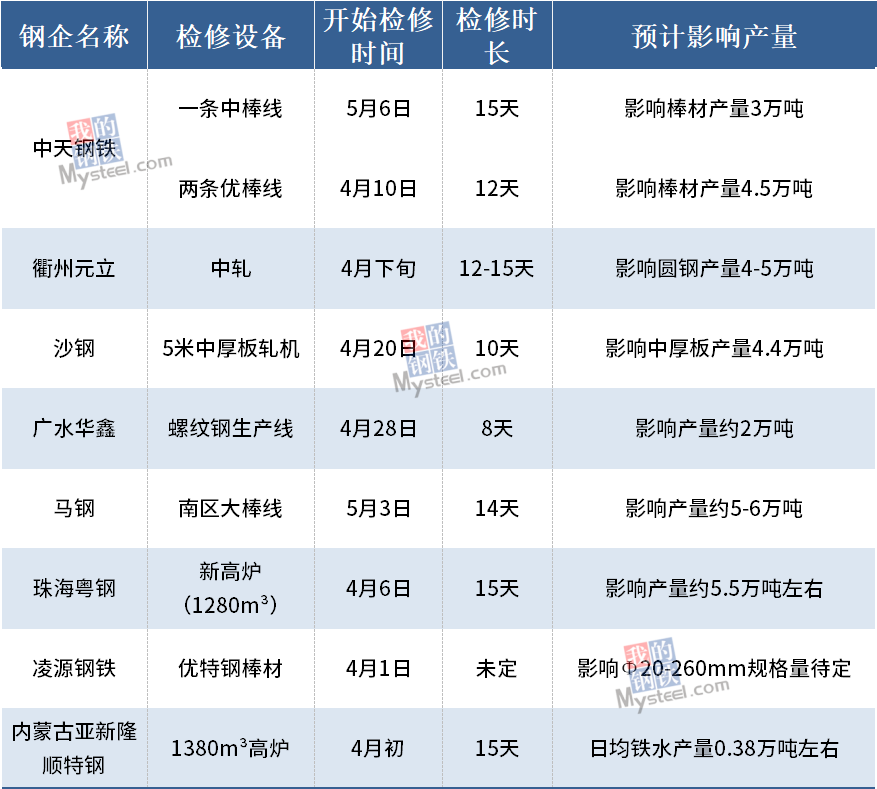據(jù)Mysteel不完全統(tǒng)計(jì),2021年4月有8家鋼廠公布檢修計(jì)劃。其中,馬鋼計(jì)劃于5月3日開(kāi)始對(duì)南區(qū)大棒線進(jìn)行檢修,預(yù)計(jì)檢修14天,總計(jì)影響產(chǎn)量約5-6萬(wàn)噸。其次,珠?;涗摪舨纳a(chǎn)線計(jì)劃于4月6日開(kāi)始停產(chǎn)檢修,計(jì)劃為期15天,預(yù)計(jì)到4月20日復(fù)產(chǎn),影響產(chǎn)量約5.5萬(wàn)噸左右。具體情況如下: