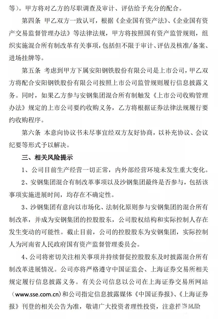 2、安鋼集團混合有制改革事項以及沙鋼集團最終是否參與,包括該事項實施進展時間,均存在不確定性。