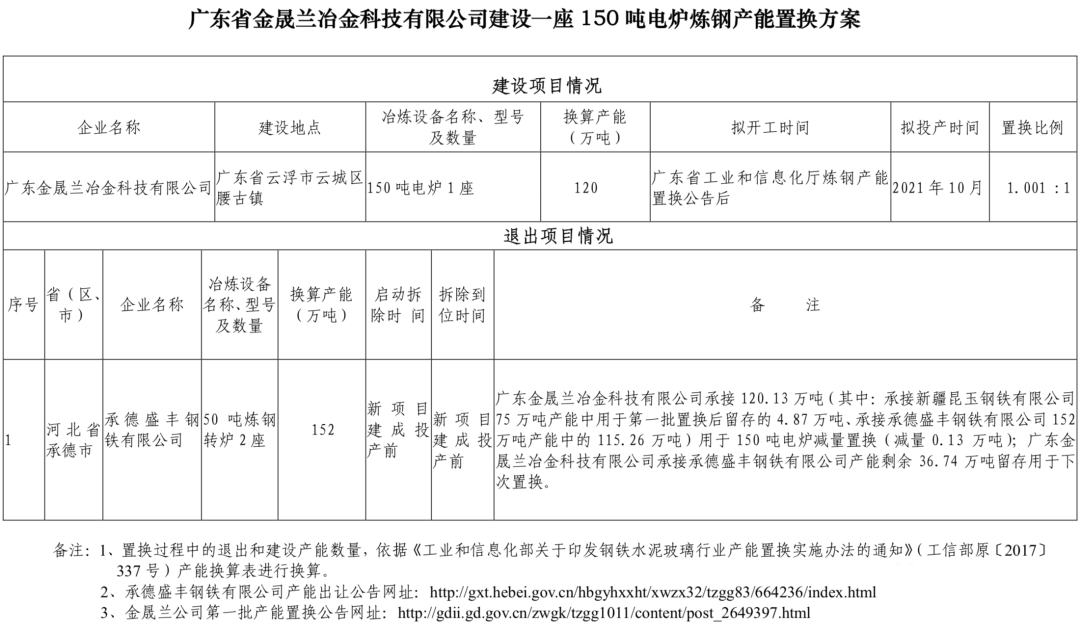 按照《國(guó)務(wù)院關(guān)于化解產(chǎn)能嚴(yán)重過剩矛盾的指導(dǎo)意見》(國(guó)發(fā)〔2013〕41號(hào))、《國(guó)務(wù)院關(guān)于鋼鐵行業(yè)化解過剩產(chǎn)能實(shí)現(xiàn)脫困發(fā)展的意見》(國(guó)發(fā)〔2016〕6號(hào))、《工業(yè)和信息化部關(guān)于印發(fā)鋼鐵行業(yè)產(chǎn)能置換實(shí)施辦法的通知》(工信部原〔2021〕46號(hào))和《工業(yè)和信息化部關(guān)于印發(fā)鋼鐵水泥玻璃行業(yè)產(chǎn)能置換實(shí)施辦法的通知》(工信部原〔2017〕337號(hào))要求,經(jīng)企業(yè)申請(qǐng)、云浮市工業(yè)和信息化主管部門初審、我廳審核并進(jìn)行網(wǎng)上公示無異議,現(xiàn)將廣東金晟蘭冶金科技有限公司建設(shè)一座150噸電爐煉鋼產(chǎn)能置換方案予以通告,歡迎社會(huì)公眾進(jìn)行監(jiān)督。