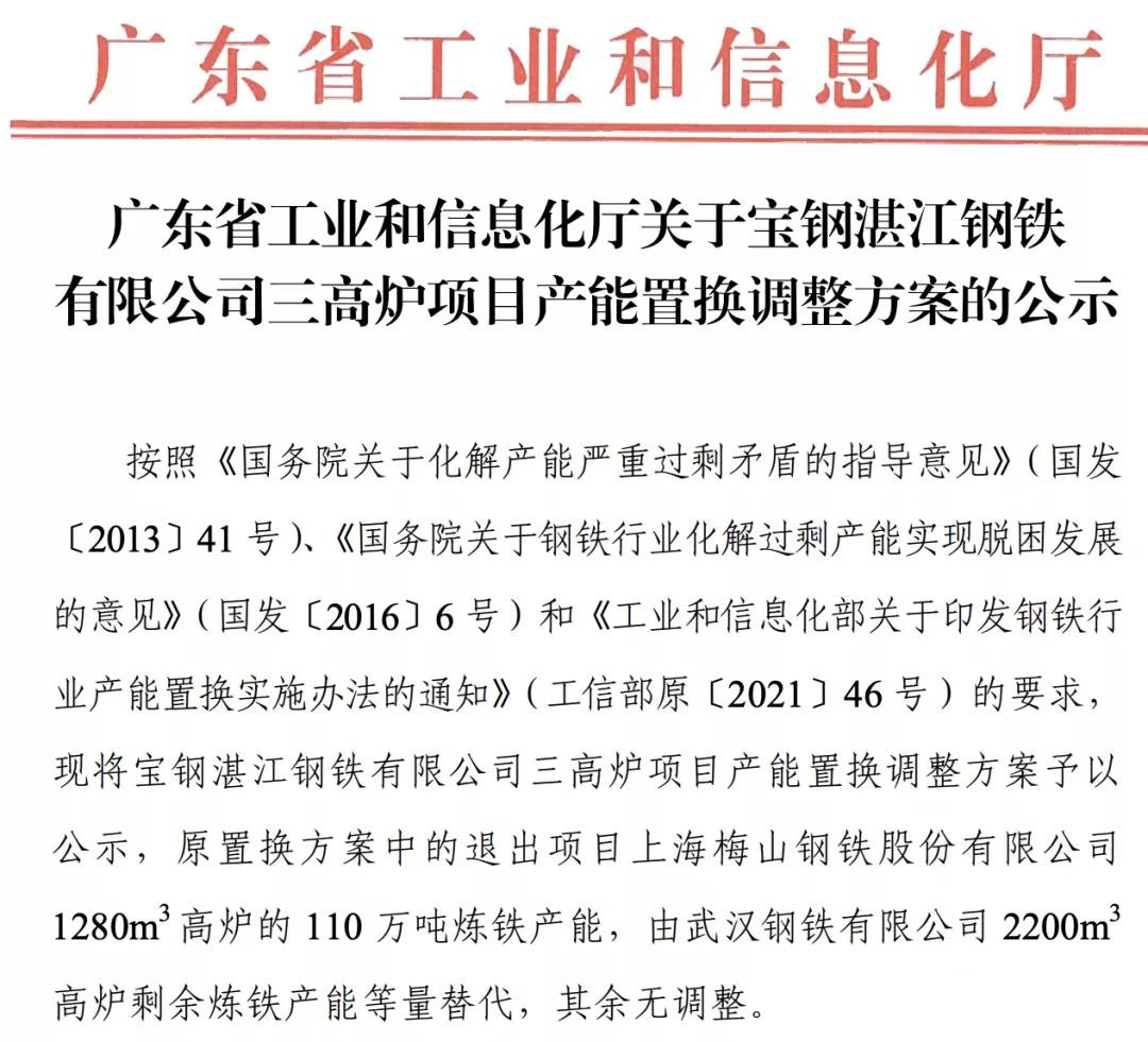 按照《國(guó)務(wù)院關(guān)于化解產(chǎn)能嚴(yán)重過(guò)剩矛盾的指導(dǎo)意見(jiàn)》(國(guó)發(fā)〔2013〕41號(hào))、《國(guó)務(wù)院關(guān)于鋼鐵行業(yè)化解過(guò)剩產(chǎn)能實(shí)現(xiàn)脫困發(fā)展的意見(jiàn)》(國(guó)發(fā)〔2016〕6號(hào))和《工業(yè)和信息化部關(guān)于印發(fā)鋼鐵行業(yè)產(chǎn)能置換實(shí)施辦法的通知》(工信部原〔2021〕46號(hào))的要求,現(xiàn)將寶鋼湛江鋼鐵有限公司三高爐項(xiàng)目產(chǎn)能置換調(diào)整方案予以公示,原置換方案中的退出項(xiàng)目上海梅山鋼鐵股份有限公司1280m3高爐的110萬(wàn)噸煉鐵產(chǎn)能,由武漢鋼鐵有限公司2200m3高爐剩余煉鐵產(chǎn)能等量替代,其余無(wú)調(diào)整。