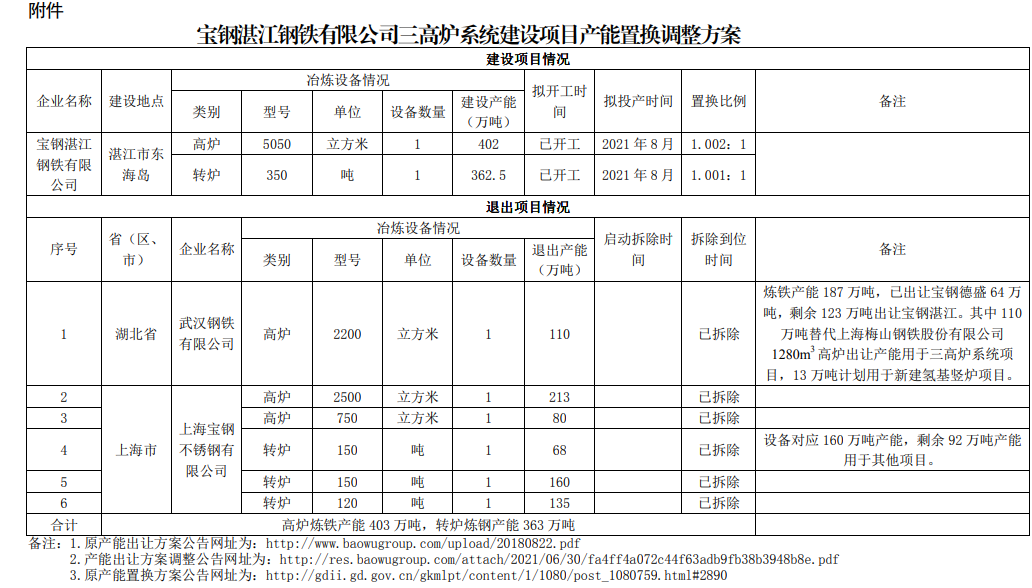 根據(jù)產(chǎn)能置換方案,寶鋼湛江鋼鐵有限公司擬新建5050立方米高爐1座,350噸轉(zhuǎn)爐1座,涉及煉鐵產(chǎn)能402萬(wàn)噸,煉鋼產(chǎn)能362.5萬(wàn)噸。