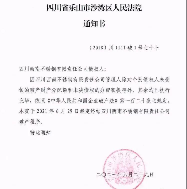 6月29日,四川省樂山市沙灣區(qū)人民法院裁定終結四川西南不銹鋼有限責任公司破產程序。