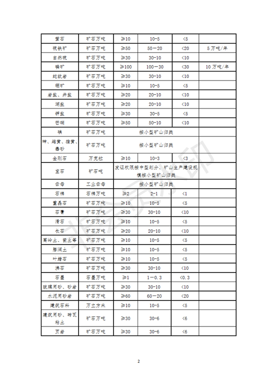 礦山規(guī)模等級(jí)劃分按照《關(guān)于調(diào)整部分礦種礦山生產(chǎn)建設(shè)規(guī)模標(biāo)準(zhǔn)的通知》中的分類表執(zhí)行(見(jiàn)附件)。